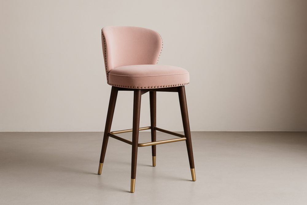 Sgabello in Velluto con Gambe in Legno e Dettagli in Metallo